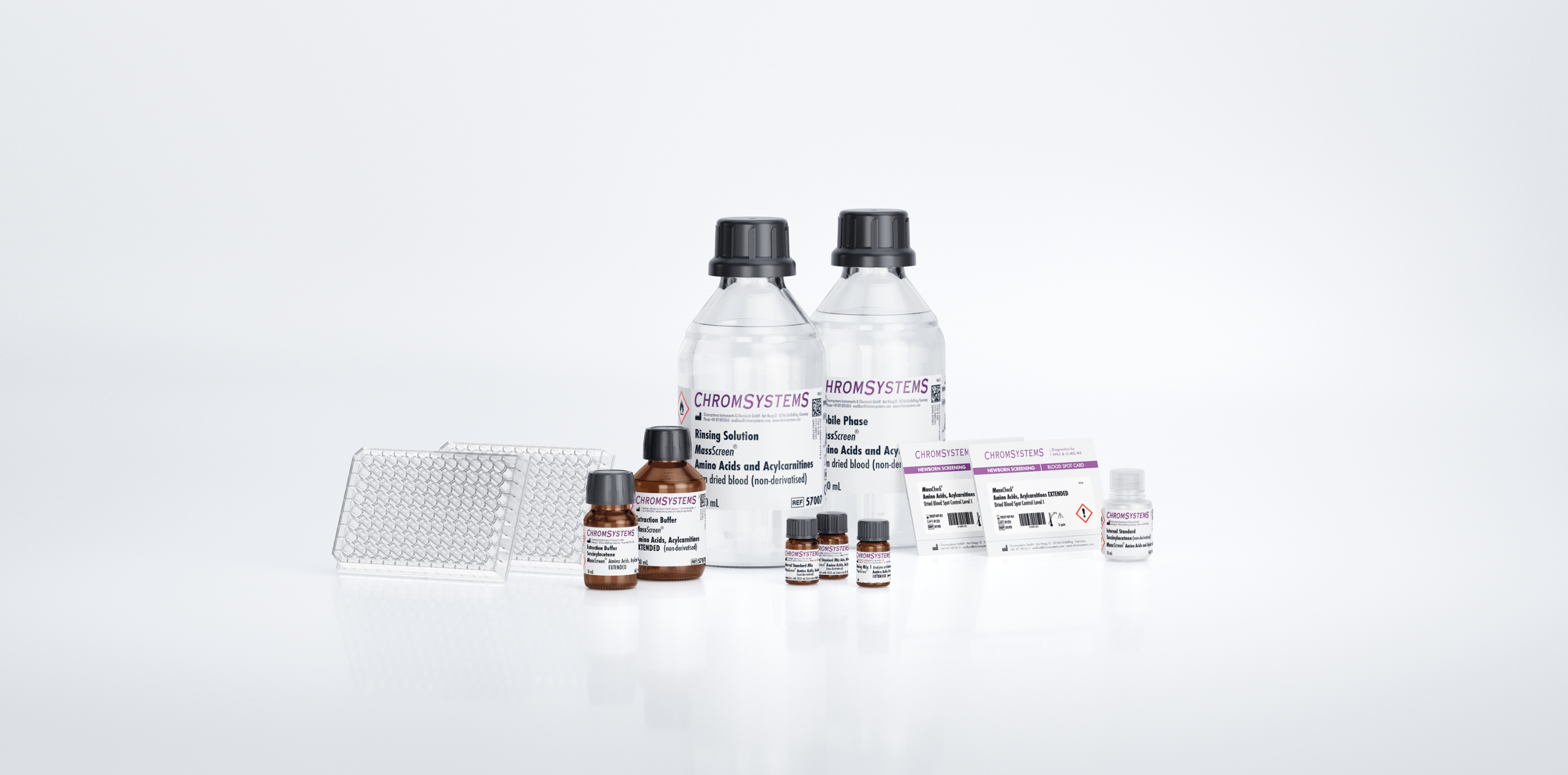 Este Kit permite a determinação semi-quantitativa, simples e rápida, de aminoácidos, acilcarnitinas, cetonas, creatina e lisofosfolipídeos em spots de sangue seco para triagem neonatal de distúrbios do metabolismo dos ácidos graxos e aminoácidos pela espectrometria de massa em tandem. O sistema LS-MS/MS é composto por uma bomba de HPLC, um injetor e um espectrômetro de massa em tandem com sensibilidade adequada.